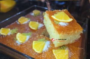 9.Revanimizin keki şerbetini tamamen çekince dilimleyelim ve her dilimin üzerini hindistan cevizi ve portakal dilimiyle süsleyip servis edelim.