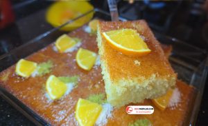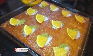 9.Revanimizin keki şerbetini tamamen çekince dilimleyelim ve her dilimin üzerini hindistan cevizi ve portakal dilimiyle süsleyip servis edelim.