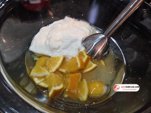 2. Derin karıştırma kabına sıvıyağı, yoğurdu, toz şekeri, yumurtaları ve kabuğu ile dilimlediğimiz portakalı koyalım ve ister el blenderi ister normal blenderla iyice ezip parçalayıp homojen bir karışım elde edelim.