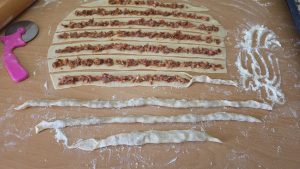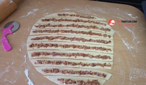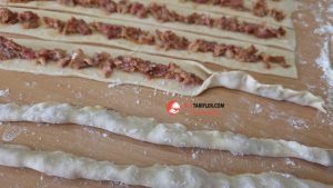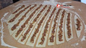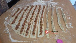 7. Kıymalı iç harçtan hamurun üzerine uzunlamasına koyalım ve hamurun her iki tarafını birleştirip kapatalım ve uzun şeritler elde edelim.