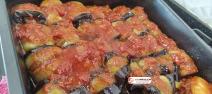 9. Hazırladığımız sosu fırın tepsisindeki patlıcanların üzerine gezdirelim.