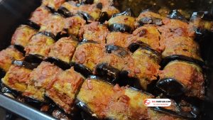 6. Kızarttığımız patlıcanları teker teker tezgaha alalım ve üzerine biraz kıyma koyup yayalım ve rulo şeklinde saralım.