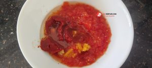 8. Bir kaseye rendelenmiş domates, domates salçası, suyu, sıvıyağı ve ezilmiş sarımsağı alıp karıştıralım.