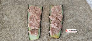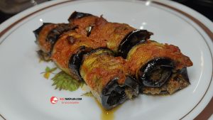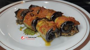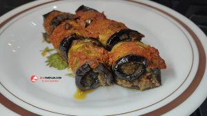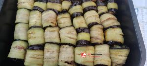 6. Kızarttığımız patlıcanları teker teker tezgaha alalım ve üzerine biraz kıyma koyup yayalım ve rulo şeklinde saralım.