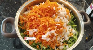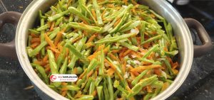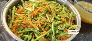 8. Malzeme miktarına uygun bir tencereye temizleyip hazırladığımız taze fasulyeleri, rendelenmiş havucu, küp halinde doğranmış kuru soğanı ve ufak doğranmış sarımsakları ekleyip alt üst harmanlayalım.
