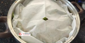 11.Yağlı kağıdı tencerenin genişliğinde keselim, ortasına da küçük bir delik açalım ve malzemelerin üzerine kapak gibi kapatalım.