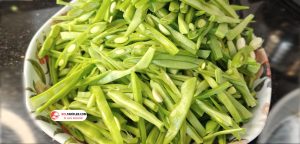 3. Doğrama tahtasında bıçak yardımıyla taze fasulyeleri ince uzun verev olarak keselim.