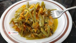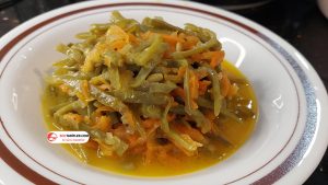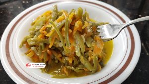 8. Malzeme miktarına uygun bir tencereye temizleyip hazırladığımız taze fasulyeleri, rendelenmiş havucu, küp halinde doğranmış kuru soğanı ve ufak doğranmış sarımsakları ekleyip alt üst harmanlayalım.