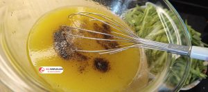 6. Ayrı derin küçük bir kapta portakal suyu, limon suyu ve zeytinyağını karıştırıp çırpıcı ile iyice çırpalım.