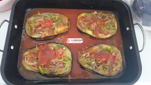 13. Sosu için su ve salçayı bir kasede çırpalım, tepsiye patlıcanların üzerine gelmeyecek şekilde sosu dökelim.