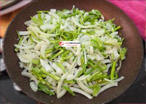 6. Tencereye 4 yemek kaşığı sıvıyağı ekleyelim, üzerine doğradığımız kuru soğanları ve yeşil sivri biberleri ekleyip karıştıralım, hafif diriliği gidecek kadar kavuralım.