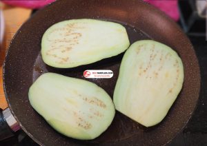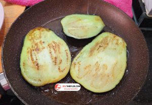3. Tavayı ocağa alalım ve kestiğimiz patlıcanları arkalı önlü kızartalım.