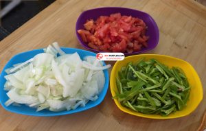 5. Kuru soğanları piyazlık olarak ay şeklinde doğrayalım, biberleri ince uzun jülyen şekilde keselim, domatesin kabuğunu soyup küçük küçük doğrayalım, kaşar peynirini rendeleyelim.