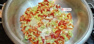 6. İnce ince doğradığımız yeşil biber ve kapya biberleri ekleyip diriliği hafif gidene kadar kavuralım.