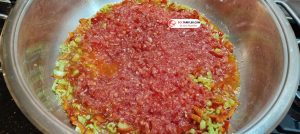 4. Domateslerin kabuğunu soyup küçük küçük doğrayalım veya sert kabuklu ise isteğe bağlı olarak kabuğunu soymadan mutfak robotundan geçirelim.