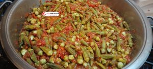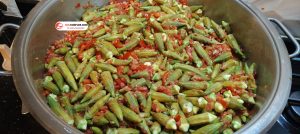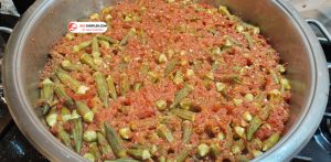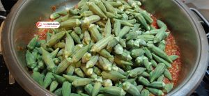 8. Yıkayıp temizlediğimiz bamyaları domatesli harcın üzerine ekleyelim, limon suyunu da ekleyip alt üst karıştırıp tencerenin kapağını kapatalım ve sararıncaya kadar orta ateşte ön pişirme yapalım.