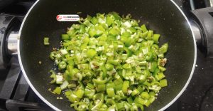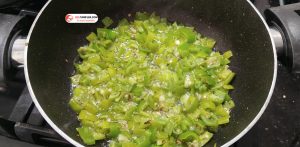 4. Büyük bir tencereyi ocağa alalım, sıvıyağı ekleyelim ve üzerine ince ince doğradığımız yeşil biberleri ekleyip hafif diriliği gidene kadar pişirelim.