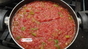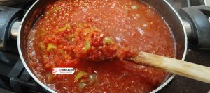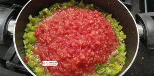 5. Doğradığımız veya mutfak robotundan geçirdiğimiz domatesleri biberlerin üzerine ekleyip tuzunu ilave edelim ve karıştıralım.