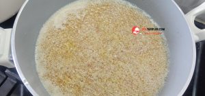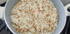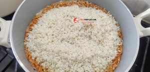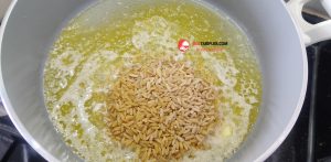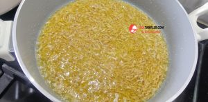 7. Kavrulan arpa şehriyelerin üzerine pirinçleri ekleyelim ve karıştıralım.