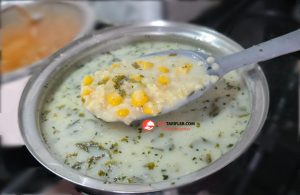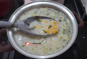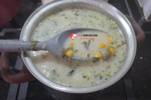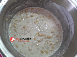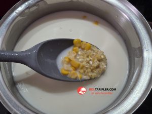 1. Derin çorba tenceresine yoğurt, buğday yarması, haşlanmış mısır, un ve nişastayı koyalım ve iyice çırpalım.