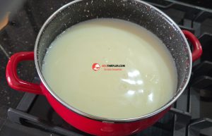 1. Öncelikle tencereye süt, toz şeker ve vanilyayı alalım, içindeki toz şeker eriyinceye kadar karıştırarak ısıtalım, şekeri eriyince ocağı kapatalım (kaynatmaya gerek yok).
