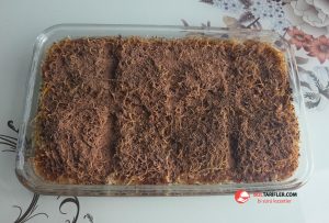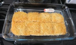 2. Hazır kızarmış kadayıfı fırın kabına alalım ve fırında ısıtalım.