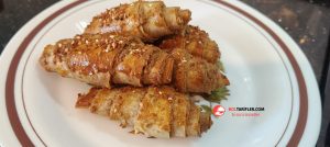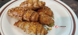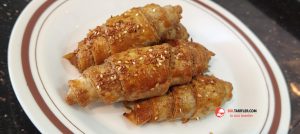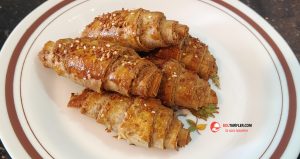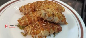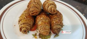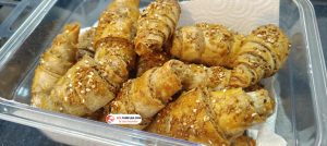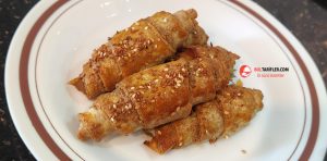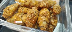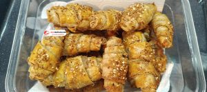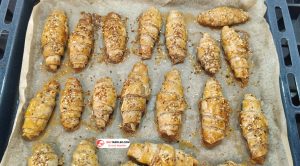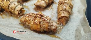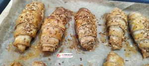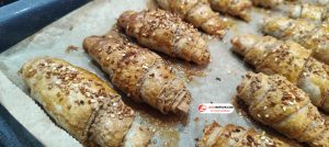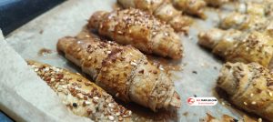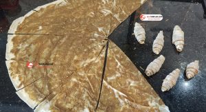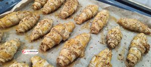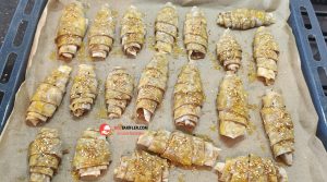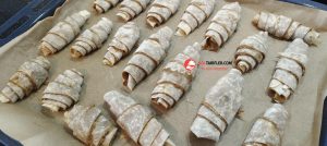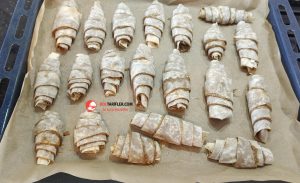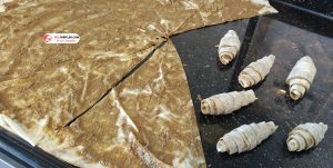 8. Tüm üçgen yufkalara rulo sarma işlemini uygulayalım ve sardıktan sonra fırın tepsisine dizelim.
