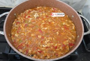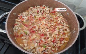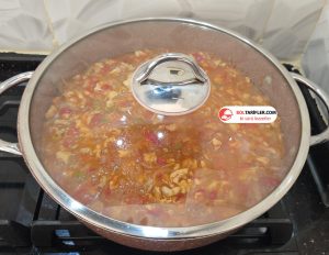 16. Üzerine yarım çay bardağı su ekleyip önce orta ateşte, kaynamaya başlayınca kısık ateşte 10 dk pişirelim.
