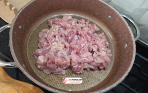 11. Bir tencereye 1 yemek kaşığı sıvıyağ ve doğradığımız tavuk etlerini alalım.