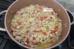 12. Hafif kavurup rengi dönünce soğanları, yeşil biberi ve kapya biberi ekleyip karıştıralım.