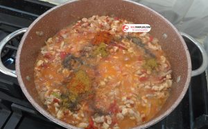 14. Domates salçasını ve baharatları ekleyip tekrar karıştıralım.