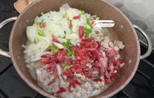 12. Hafif kavurup rengi dönünce soğanları, yeşil biberi ve kapya biberi ekleyip karıştıralım.