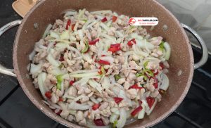 11. Bir tencereye 1 yemek kaşığı sıvıyağ ve doğradığımız tavuk etlerini alalım.