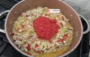 14. Domates salçasını ve baharatları ekleyip tekrar karıştıralım.