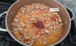16. Üzerine yarım çay bardağı su ekleyip önce orta ateşte, kaynamaya başlayınca kısık ateşte 10 dk pişirelim.