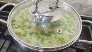 5. Çorba kaynamaya başlayınca ocağı kısık ayara alalım ve ince doğranmış taze kişnişleri ekleyelim.