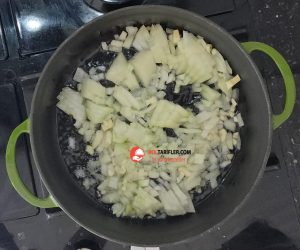 1. Öncelikle çok derin olmayan bir tencereye sıvıyağı koyalım ve ince ince doğranmış kuru soğanları ekleyip hafif şeffaflaşana kadar kavuralım.