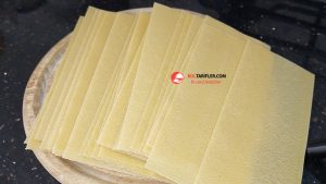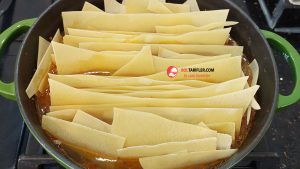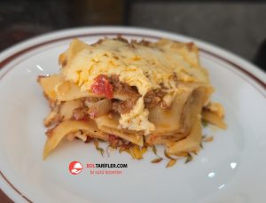 5. Lazanya yapraklarını uzunlamasına ikiye kıralım ve diklemesine kıymalı harcın üzerine dizelim.