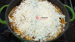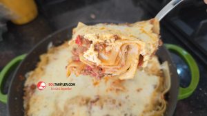 7. Lazanyalar yumuşadığında hafifçe karıştıralım ve üzerine rendelenmiş kaşar peynirini serpip tekrar kapağını kapatalım ve peynirler eriyinceye kadar bekletelim.