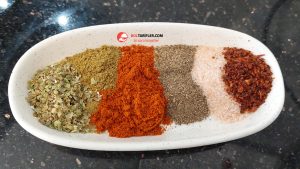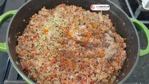 4. Baharatları ekleyip tekrar karıştıralım. (tuz, karabiber, toz kırmızı biber, kimyon, kekik, pulbiber).