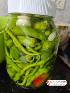 2. Kavanozun dibine doğranmış 1 diş sarımsak koyalım ve üzerine biberleri dolduralım, en üste yine doğranmış 1 diş sarımsak koyalım.