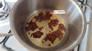 3. Ayrı bir tencereye sıvıyağı ve salçayı koyup salçanın kokusu çıkana kadar yakmadan kavuralım.