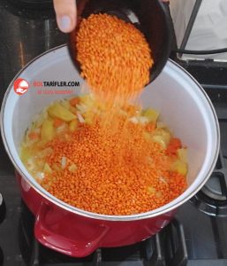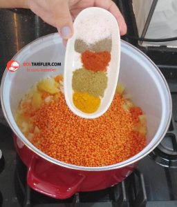 5. Üzerine kırmızı mercimeği ve baharatları (tuz, karabiber, kimyon, zerdeçal, kırmızı toz biber) ekleyelim ve alt üst karıştıralım.