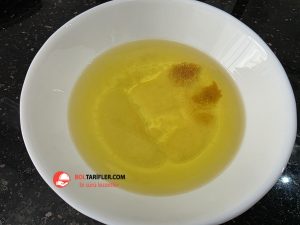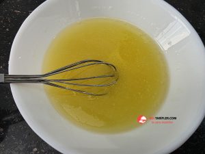 6. Ayrı bir kapta zeytinyağı, sıkılmış limon suyu, ezilmiş sarımsak ve tuzu çırpıcı ile iyice çırpıp karıştıralım. (isterseniz bu malzemeleri bir kavanoza koyup iyice sallayarak da karıştırabilirsiniz).